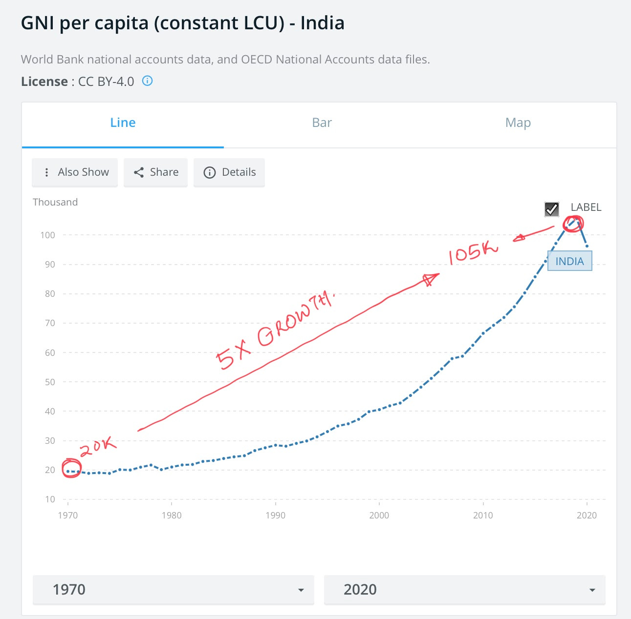 The metric which explains this the best is the Gross National Income per capita at constant prices.